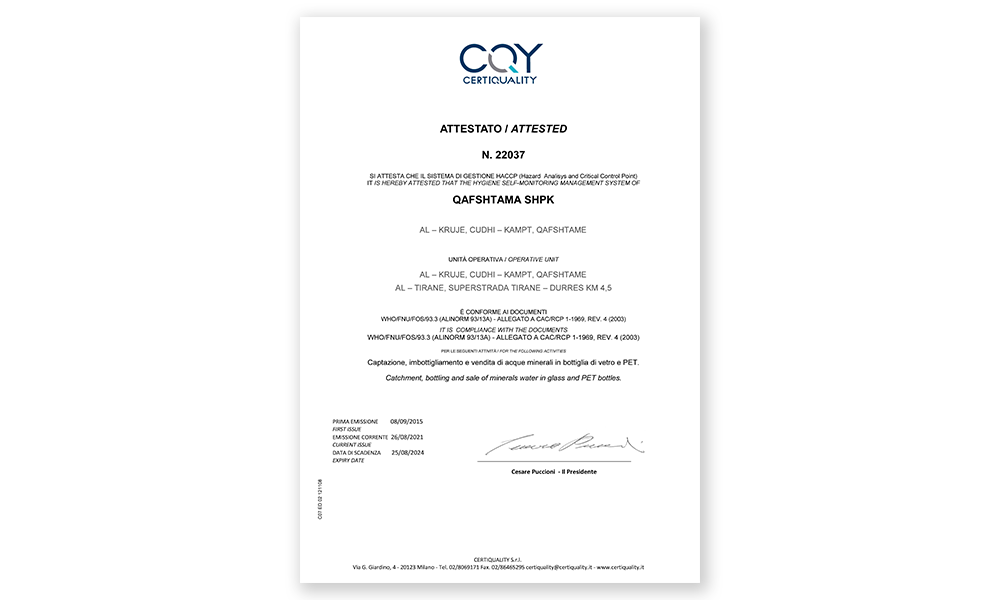 Një sistem menaxhimi me fokus sigurinë ushqimore ku kjo e fundit trajtohet përmes analizës dhe kontrollit të rreziqeve biologjike, kimike dhe fizike nga prodhimi, prokurimi dhe trajtimi i lëndës së parë, deri te prodhimi, shpërndarja dhe konsumimi i produktit të përfunduar. Kompania ka një politikë specifike të cilësisë së korporatës, e orientuar drejt kontaktit të vazhdueshëm me klientin për të kuptuar nevojat e tyre dhe për t'u përpjekur jo vetëm t'i kënaqë ato, por edhe t'i paraprijë ato, duke propozuar zgjidhje, inovacione dhe duke sugjeruar partneritete. Kjo politikë përcakton objektivat për menaxhimin dhe përmirësimin e sigurisë, ligjshmërisë dhe cilësisë së produkteve.
